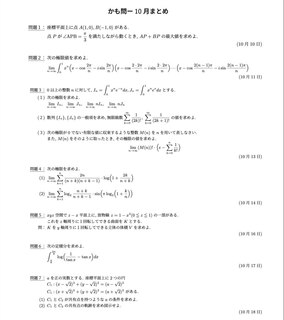 かも浪さんの作問集2023.10.212023.10.22この記事は約1分で読めます。10月10日〜18日PDFファイルはこちらから.解答については,かも浪さんご本人のツイートにありますので是非ご覧ください.Tweets by kam0_uts